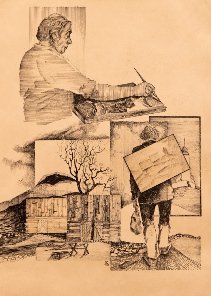 « A tábor életéből I. Művészek Szárhegyen » A tábor életéből II. Leltári szám: 216 Méret: 45 x 30 cm Technika: rajz, tus