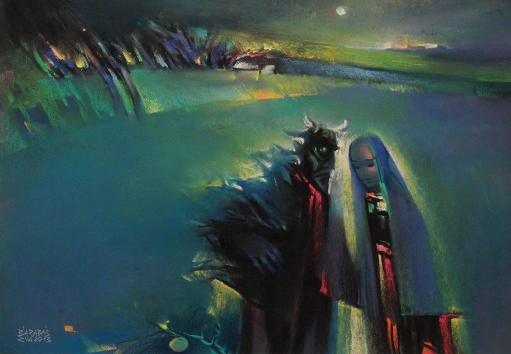 « Kiterített táj Szárhegyi táj » Csábítás Leltári szám: 1879 Ország: Románia Méret: 50 x 35 cm Technika: pasztell Katalógus: 2015